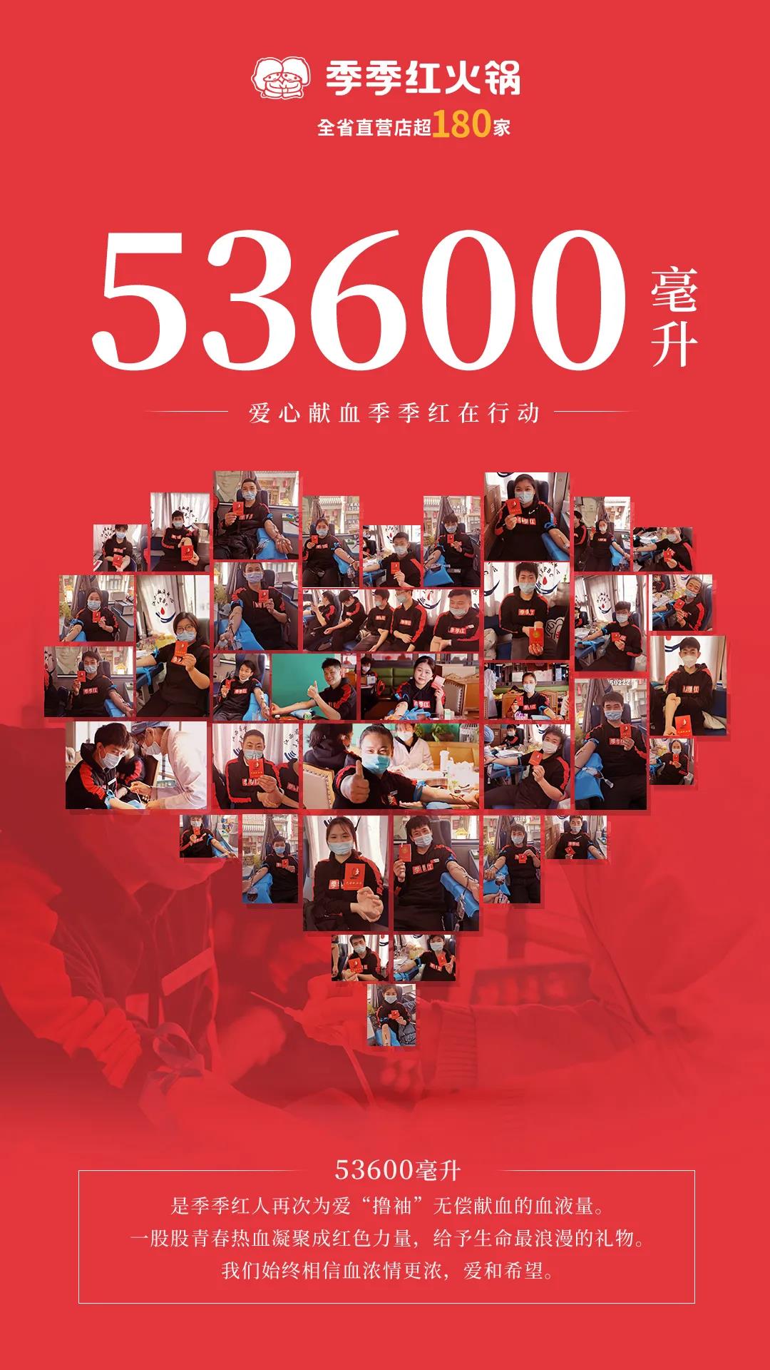 每年的冬春季节都是血液紧缺时期,随着今年新冠疫情的反复,为防范疫情,江西省血液中心号召社会和个体单位积极爱心献血,用热血为生命接力。1月20日,季季红火锅积极响应省血液中心号召,300余名季季红人踊跃报名献血,在4个献血点成功献出53600毫升血液量。