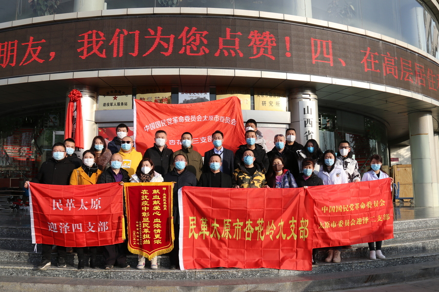 太原市血液中心主任白林为他们赠送“献血献爱心,血浓情更浓,在抗疫中彰显民革担当”锦旗,感谢他们应急而动,奉献爱心,灾难面前共克时艰,困难面前守望相助的大爱精神。