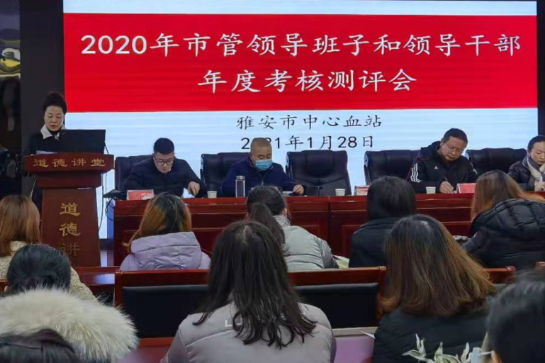 1月28日,雅安市中心血站2020年市管领导班子和领导干部年度考核测评会在市公共卫生服务中心业务楼五楼会议室召开,市纪委监委驻卫健委纪检组组长李正彬、副组长汤凌翔、市卫健委人事科敬山林一行3人到会监督指导,会议由市中心血站党支部书记、站长喻琼主持,血站班子成员、全体在编职工参会。