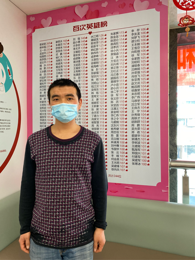 他从2008年大学开始参加成分献血。一路走来,站在荣誉墙前这位腼腆内敛的大男孩儿,献血总量已经达到了40000余毫升。日拱一卒,功不唐捐——这是对他坚持了十年爱心之路的完美诠释。