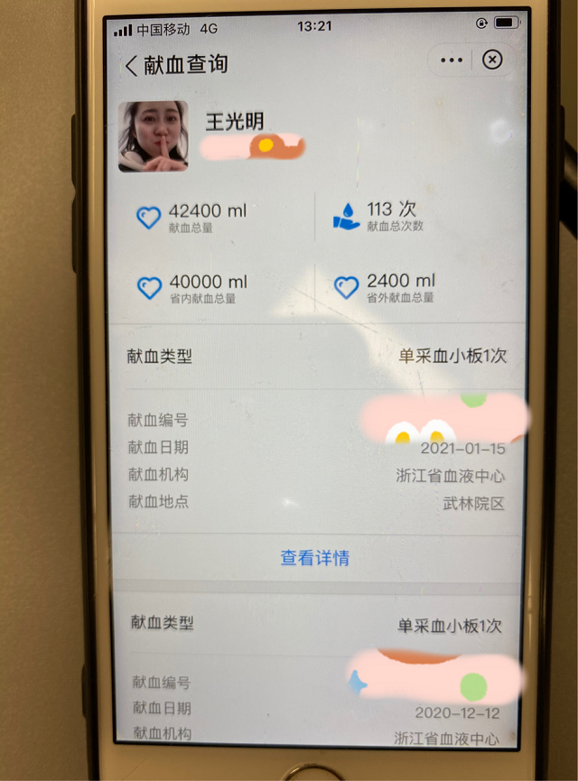 在献血的一个多小时时间里,他聊起了自己献血的心路历程。聊着聊着他骄傲地拿起手机,展示了自己支付宝卡包里一张张电子无偿献血证。比献血证更让他骄傲的是他的头像,他笑着说:“对,就是我的太太,她一直支持我来献爱心,不然我也不会坚持这么久。”爱心可贵,爱情可嘉,令人动容。