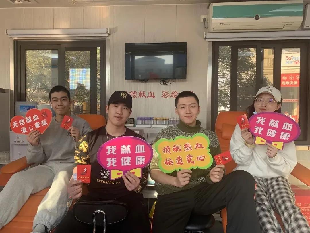 来自视觉艺术学院的陈阳、韩彧、于子贺、盛甜甜在大学城献血屋完成了成人礼的首次无偿献血,随后拍照留念发了朋友圈,鼓励身边更多的人加入无偿献血的队伍中来。