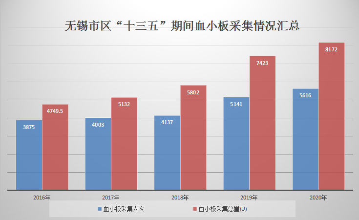 据统计,五年来市区累计采集全血20.66万人次、69.34吨,年均分别增长1.95%和4.98%,采集血小板2.28万人次、31278.5个治疗量,年均分别增长7.05%和10.59%。市区“十三五”末全血和单采血小板采集量分别达到15.84吨、8172个治疗量,同比“十二五”末分别增长26.98%和61.40%。