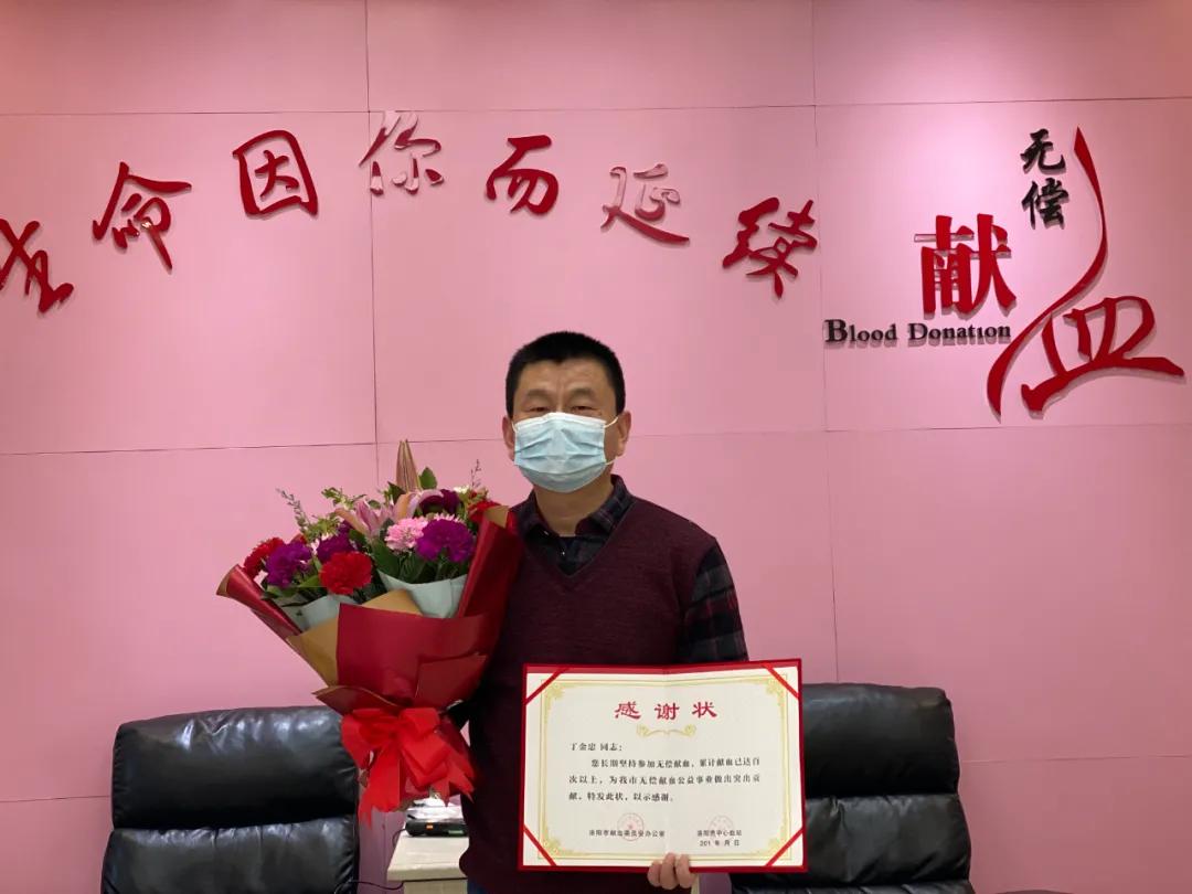 洛阳市第135位百次献血者丁金忠:第1次献血时间2000年3月19日,第100次献血时间2021年2月16日,期间共捐献全血4次1400毫升、机采成分血96次104个治疗量,先后3次荣获全国无偿献血奉献奖金奖(2012年、2014年、2018年)。