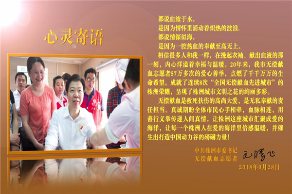 株洲市红十字无偿献血志愿者服务大队队员用强烈的社会责任感,引领广大市民积极践行社会主义核心价值观和“奉献、友爱、互助、进步”的志愿精神,切实推动无偿献血,让奉献社会成为人人可为、人人能为的新时尚,弘扬社会正能量。