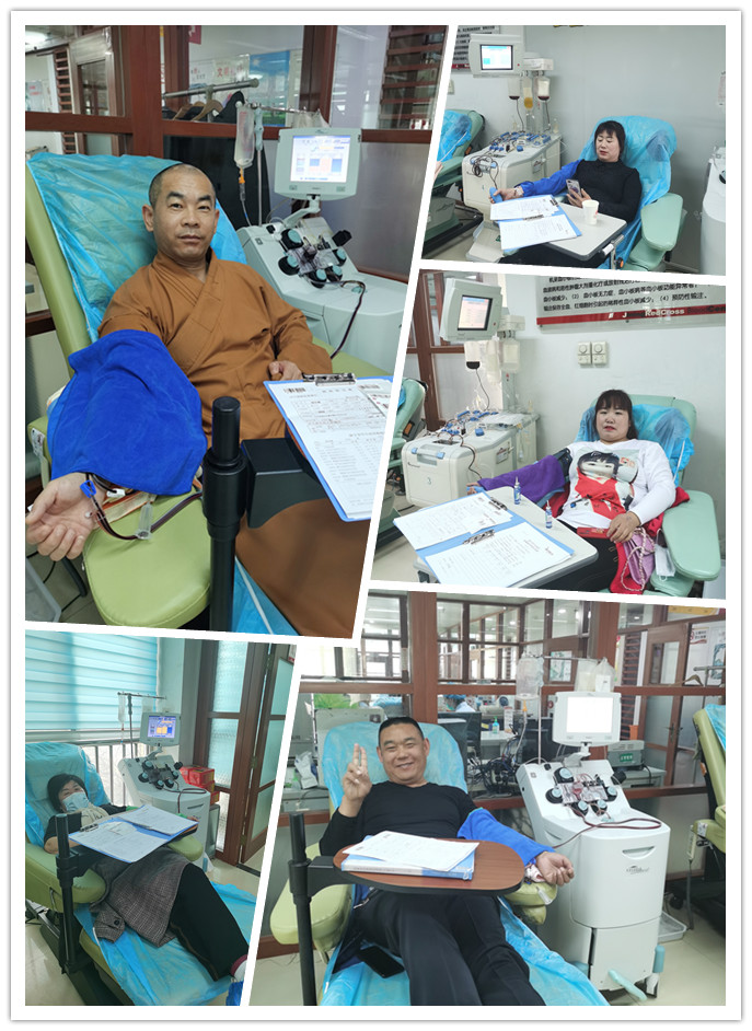 每次一到献血间隔期,宣义大师都会提前在微信群里发起号召,组织有时间的志愿者们一起乘车到血站献血。志愿者付吉翠工作繁忙,每月仅有两天休息时间,一天用来看望父母,一天用来献血,10年来共计献血24次,累计献血量7200毫升。56岁的谭玉苓现居住在济宁市区看孙子,看到群里的信息也积极地报名预约了成分血,成功捐献2个治疗量的血小板,累计献血12400毫升。