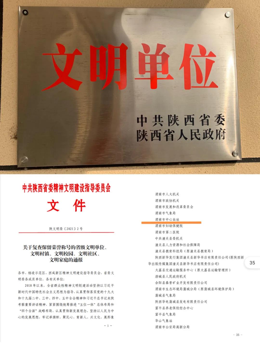 近日,陕西省委精神文明建设指导委员会印发《关于复查保留荣誉称号的省级文明单位、文明村镇、文明社区、文明家庭的通报》(陕文明委[2021]2号),渭南市中心血站顺利通过陕西省文明委“省级文明单位”复查验收,继续保留“省级文明单位”荣誉称号。