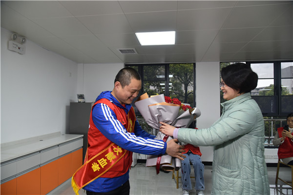 市中心血站党总支书记、站长刘昕晨为龚仕民佩戴绶带并献上鲜花