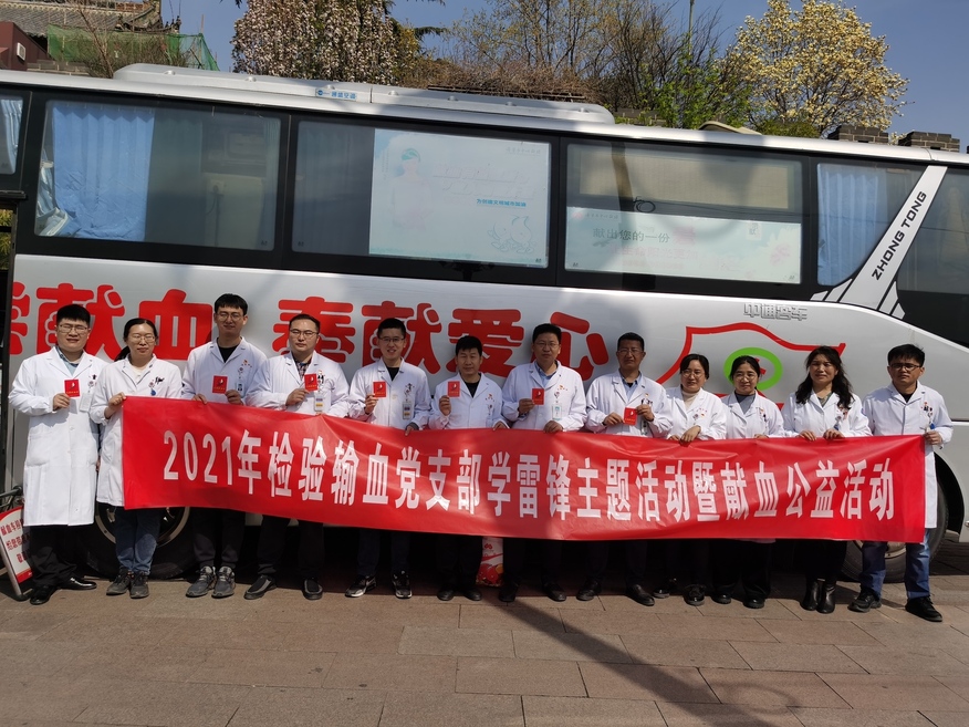 三月是学雷锋月,为了进一步弘扬雷锋精神,大力宣传无偿献血,3月24日,济宁医学院附属医院检验输血党支部开展了“2021年检验输血党支部学雷锋主题活动暨献血公益活动”,12位党支部成员来到太白楼采血点参加献血公益活动。