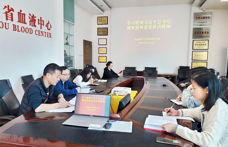 2月24日,中心第四党支部召开党员大会,要求每位党员深刻领会习近平总书记视察贵州重要讲话精神的内涵,用讲话精神武装头脑、指导实践、推动工作,自觉在思想上政治上行动上同以习近平同志为核心的党中央保持高度一致,切实把学习贯彻总书记视察贵州重要讲话精神与所从事的采供血工作和自己的岗位职责结合起来,以实际行动高质高效完成自己的本职工作,努力为中心采供血事业高质量发展贡献力量。