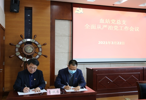李洪萍首先在会上传达了市纪委十三届六次全会和市卫生健康系统全面从严治党工作会议精神。随后,仪明刚在回顾总结血站2020年全面从严治党和党风廉政建设工作后,对血站2021年全面从严治党和党风廉政建设工作全面安排部署。仪明刚强调,2021年血站党总支要继续严格落实全面从严治党和党风廉政建设责任,着力加强党员干部队伍管理和廉政风险防控。统筹推进党建和采供血重点工作,真抓实干、拼搏巧干,努力推动各项工作任务落实,不断开创从严管党治党工作新局面。最后,仪明刚与各支部、各科室分别签订了2021年度《党风廉政建设和反腐纠风工作责任书》。