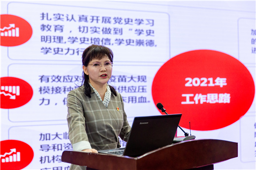 毕站长强调,2021年是中国共产党成立100周年,站在“两个一百年”的历史交汇点上,血站全体干部职工要更加紧密地团结在以习近平同志为核心的党中央周围,坚决落实全市卫生健康会议各项要求,真抓实干,开拓创新,重点落实好6项重点任务:一是扎实认真开展党史学习教育,切实做到“学史明理,学史增信,学史崇德,学史力行”;二是做好常态化疫情防控下的无偿献血宣传工作,进一步提高献血者比例;三是有效应对新冠疫苗接种期间血液供应压力,保障全市临床用血;四是提高血液标本检测能力,进一步提升血液质量;五是加大临床科学合理用血指导和资源调配,指导医疗机构完善应急状态下的临床用血方案;六是进一步健全完善采供血应急保障能力建设,建立高效的血液动员与储备机制。