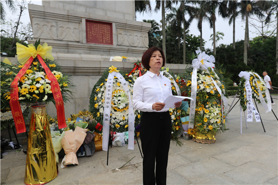 在纪念碑前,大家整齐肃穆的列队站立,党委委员、中心副主任林彩风同志致悼词,接着全体人员高唱国歌,向革命烈士敬献花篮并鞠躬默哀。