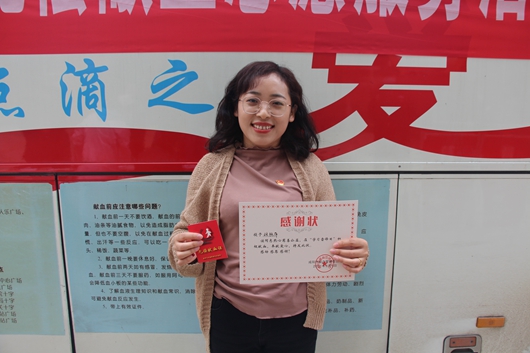离开采血点时她说:“作为一名无偿献血志愿者,我感到光荣。作为一个公务人员,特别是一名共产党员,应该具有大爱之心,而献血就是培养自己的博爱之心,有了爱心才能干好本职工作,发挥好模范先锋作用,成为一个思想境界和品德高尚的人。”