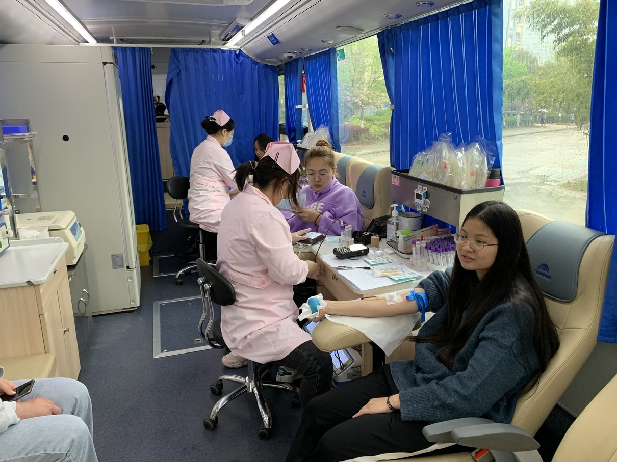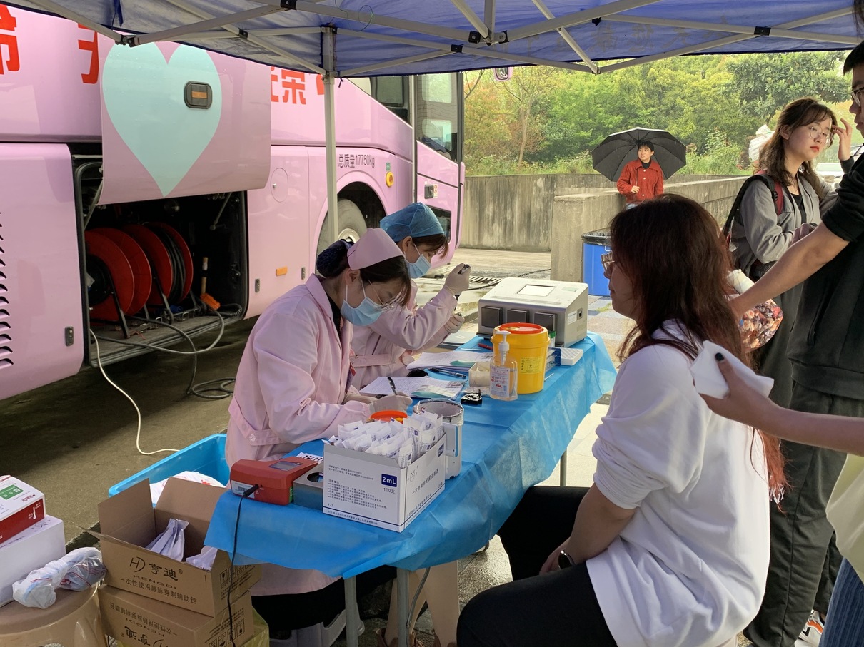 4月9日我中心走进安徽医科大学(南校区)开展无偿献血公益活动。上午时分,参加献血的同学早早的就在献血车前等候,在医护人员和现场志愿者的协助下,献血活动有序进行。大家听取工作人员讲解献血基本常识后有秩序地填表、登记、量血压、化验再进行采血。很多同学结伴而来,在校园内形成了一道靓丽的公益风景线。