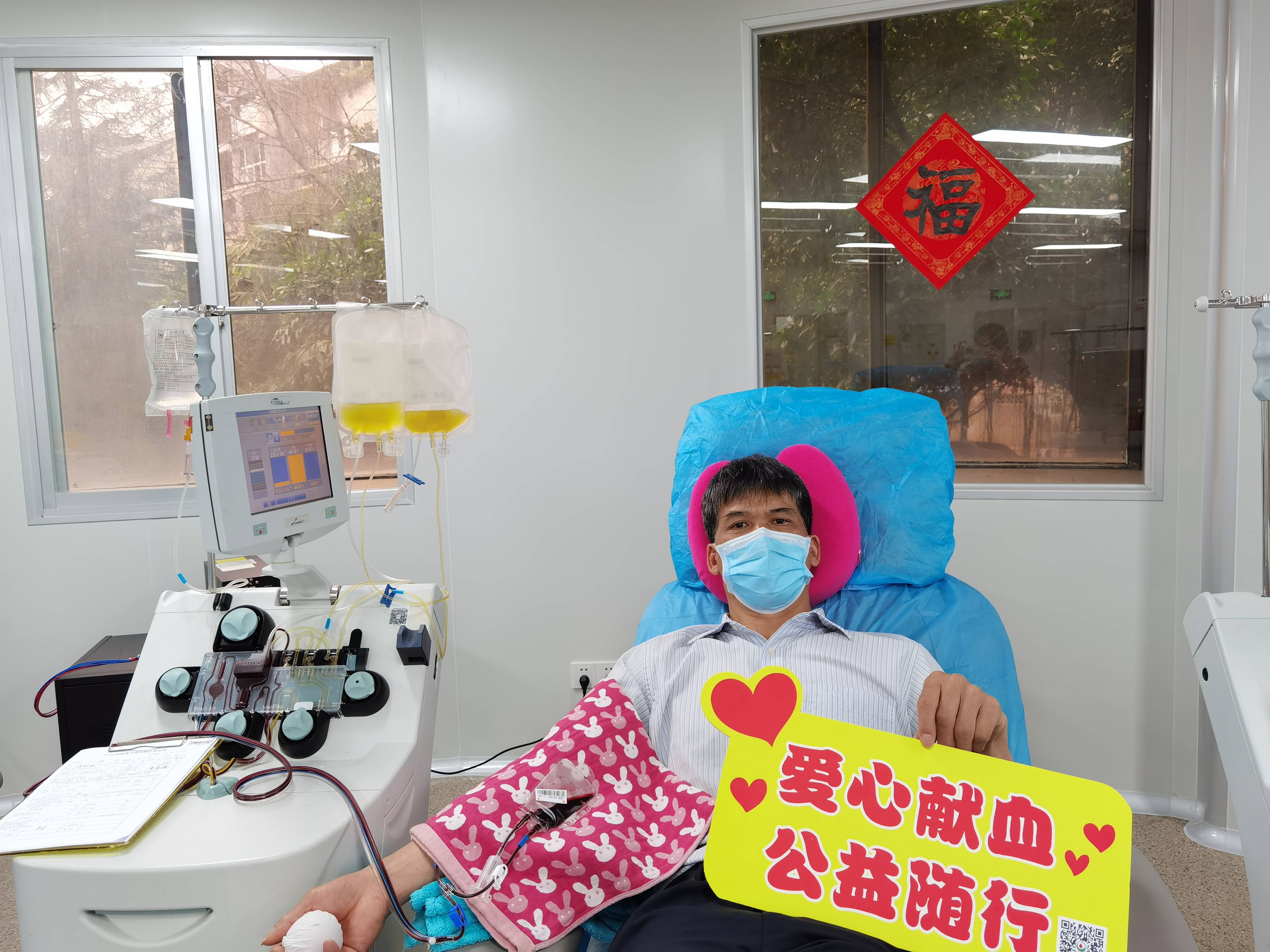 当天,覃朝滕先生成功捐献机采血小板1个治疗量,他说:“我的血液检测值只达到献一个治疗量的标准,所以基本上每次都是献一个治疗量”。这是覃先生第91次献血,总献血量达到18500毫升,荣获2016—2017年度全国无偿献血奉献奖银奖、2018—2019年度全国无偿献血奉献奖金奖、柳州市首届“献血之星”二级献血之星奖。覃先生第一次献血是在2000年,当时单位组织职工献血,就这样,覃先生开始了与无偿献血的不解之缘,因工作原因,直到2012年,覃先生才开始有规律地献血,他在献了3次全血之后,了解到捐献血小板的献血间隔时间短、恢复快、能帮助更多人的特点,覃先生于是改为捐献机采血小板。不论春夏秋冬、严寒酷暑,只要身体和条件允许,病人一旦需要他就会出现。 他说“每次收到血液中心的短信,得知自己的血液能够挽救病人生命,就感到很激动,虽然现在已经55岁,但是我的身体状况很好,我会一直坚持献到60岁,尽自己所能帮助更多的人”!