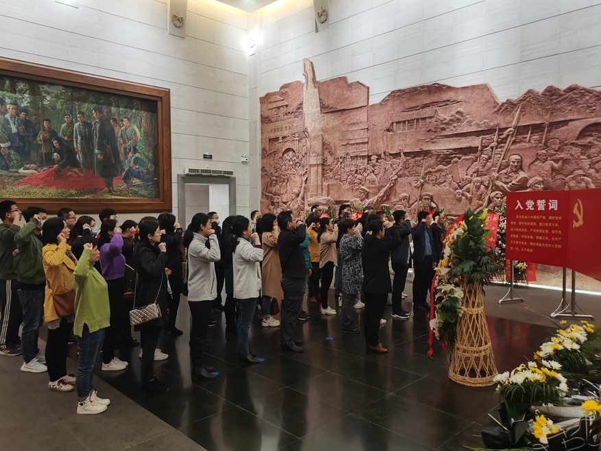在纪念堂宣誓厅,全体党员干部怀着对革命烈士无比崇敬的心情鞠躬默哀,表达对革命烈士的崇高敬意和深切缅怀。面向党旗,在李秀珍的领誓下,大家郑重重温了入党誓词:“我志愿加入中国共产党……随时准备为党和人民牺牲一切,永不叛党。”铿锵有力的誓言回荡大厅,震撼着在场的每一位党员,表达了大家对党的无限忠诚,坚定了入党使命和奋斗初心。