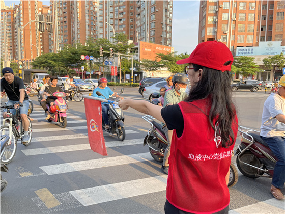 为扎实推进党史学习教育走深走实,将党史学习与社会主义核心价值观教育有机结合,引导党员继承和发扬党的优良传统,进一步提高党员服务群众意识,倡导现代文明交通理念。省血液中心党委组织55名党员组成志愿服务队于4月13至14日走上海口街头,在下班晚高峰时开展文明交通疏导和无偿献血宣传志愿服务活动。