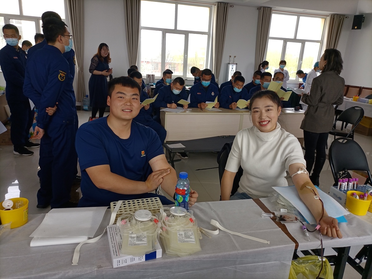 同时根据我站的要求,区消防大队官兵按照疫情防控期间规定程序,测量体温、填表、体检、化验,密切配合我站医护人员完成献血,共有28名消防官兵成功献血11200毫升,体现出他们无私奉献的精神风貌。“能用我们夫妻二人的血液帮助那些急需帮助的人,让他们重新获得健康,是我们军人义不容辞的责任。”新婚不久的年轻消防伉俪刘岩、李佳欢夫妇同时献血。用最简朴的话语表达了他们的心声。