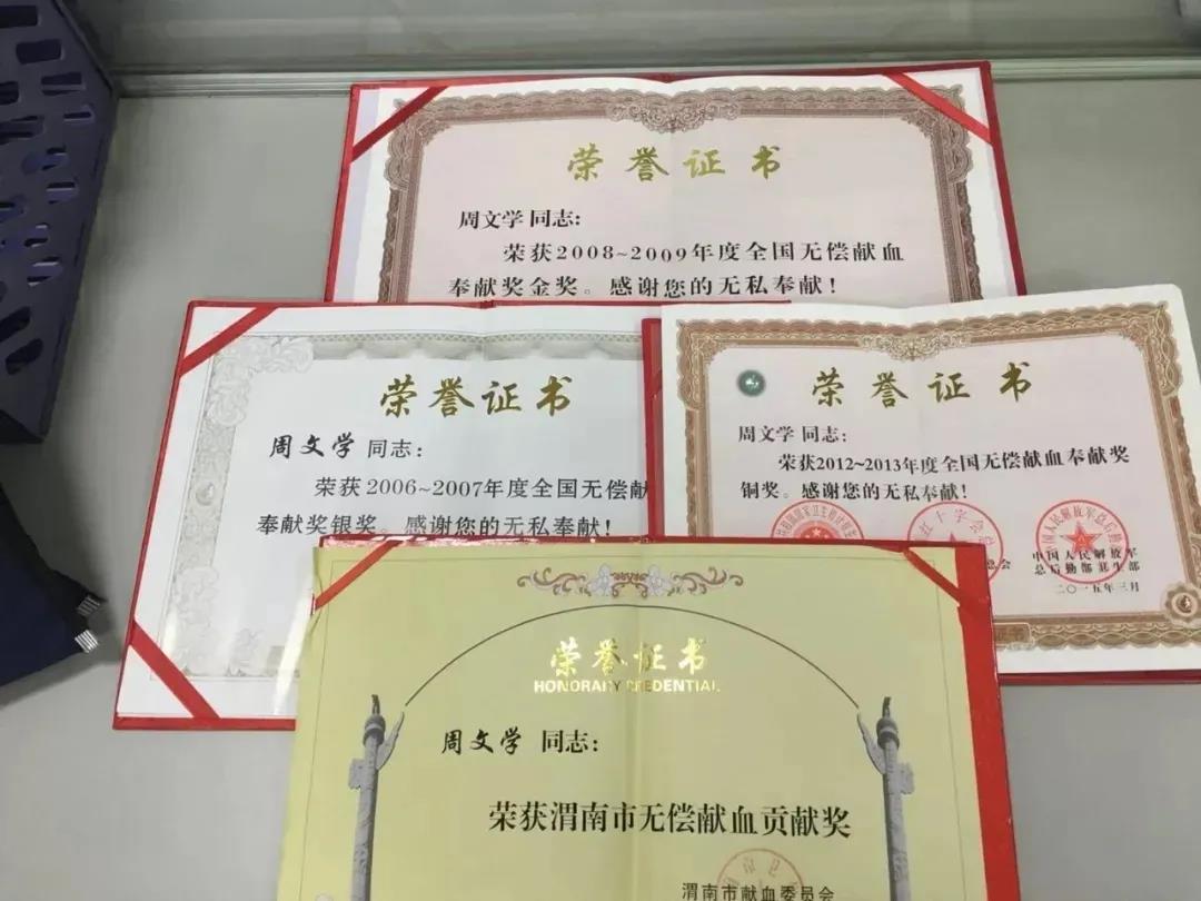2002年,周文学来到血站成为一名献血车司机,也是从那一年开始,他成为一名无偿献血志愿者,先后荣获全国无偿献血奉献奖金、银、铜奖各一次,并荣获渭南市无偿献血贡献奖。