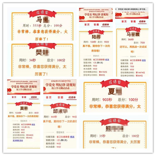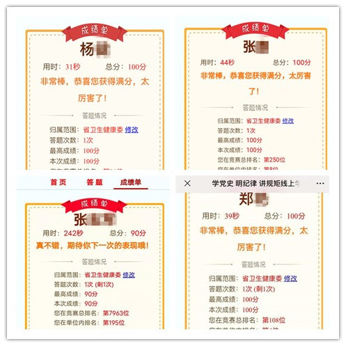 为扎实推进中心、支部党史学习教育和“牢记殷切嘱托、忠诚干净担当、喜迎建党百年”专题教育,按照中心党委要求,支部党员全员参与此次线上学习测试,从4月中旬开始,通过关注“贵州省直机关党建”微信公众号并进入测试平台,陆续开展学习、训练并完成测试,取得了理想成绩。