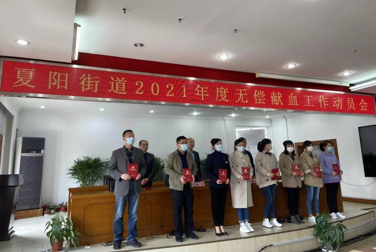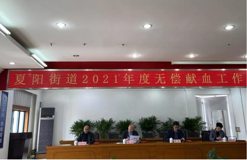 青浦区夏阳街道办事处于4月8日召开2021年度无偿献血工作动员会。夏阳街道党工委副书记、办事处主任徐川,办事处副主任陈冰,青浦区血站站长沈建国出席动员,会议由街道社区办主任蒋兰芹主持。会上对2020年度无偿献血工作优秀团体及个人进行表彰,并要求各部门积极组织配合,分批、分流进行无偿献血,保障无偿献血工作稳定、健康地发展。