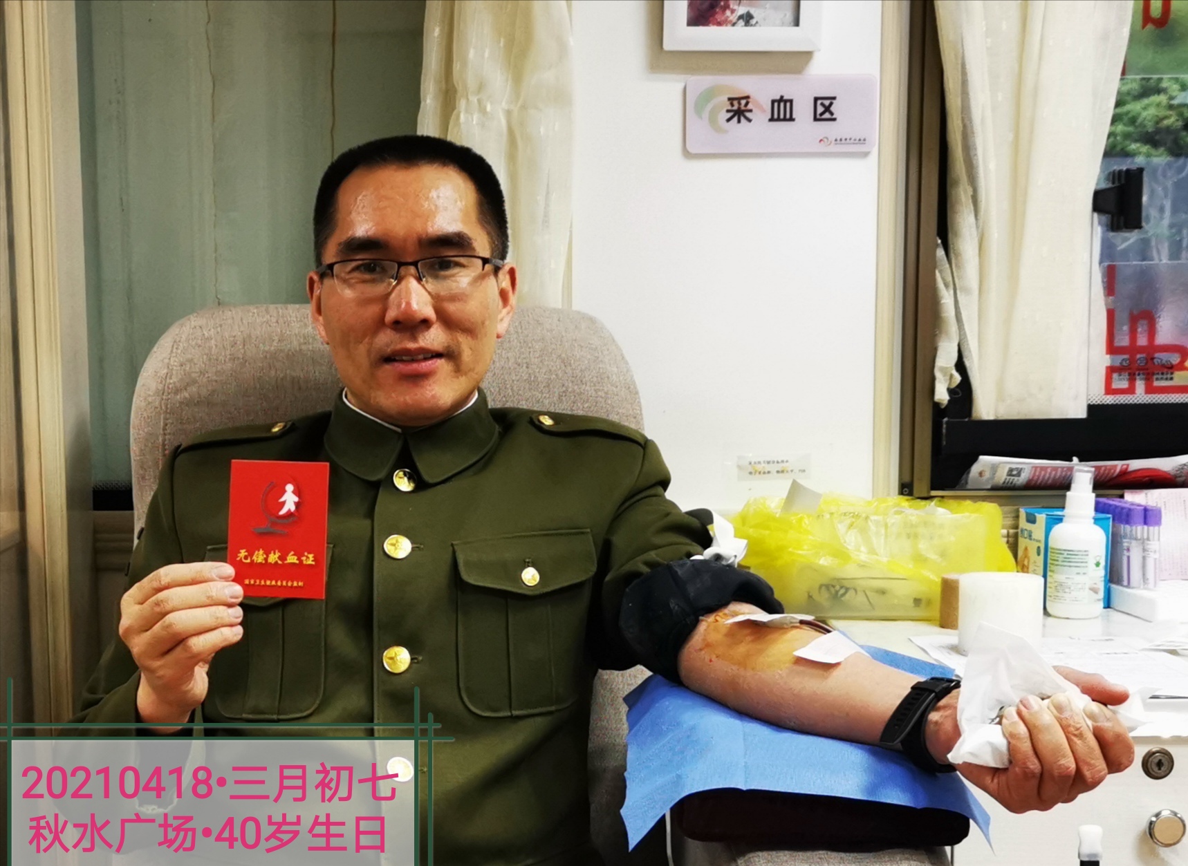 每次无偿献血都很有意义,其中最有意义的要数2015年12月12日的那一次。李老师开心地说道:那一天是我参军入伍十周年纪念日,我原本打算在这个特殊的日子,和女朋友小马老师去民政局“领证”,但翻日历一看,这天是周六,民政局不上班,我略感失落,心想“这可怎么办?”就在这时,无偿献血的念头“哧”地一下闪过——先领结婚证,再领献血证,然后两证合一。于是,我和小马老师在2015年12月11日(星期五),到南昌市红谷滩新区民政局婚姻登记处,登记结婚并领取了结婚证,从而正式结为合法夫妻;第二天,在爱人小马同志的陪伴下,我拿着结婚证去无偿献血,并领取了一本新的献血证,用“两证合一”的方式纪念自己“参军入伍十周年”,这样岂不是更有意义?…… 赠人玫瑰,手有余香!无偿献血,不仅是帮助他人,更是惠及自己,何乐而不为?今年40岁,古人云“四十不惑”,李老师觉得还有很多惑要去解,然而有一点他却坚信不疑,那就是—“善有善报”!!退伍不褪色!向善良有爱的李老师学习、致敬!