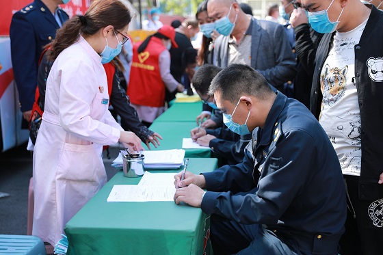 无偿献血现场,来自深泽县公安局、深泽县供电公司、深泽县医院、深泽县经济开发区、深泽县应急管理局、深泽镇、白庄乡等机关事业单位、乡镇的党员干部职工在献血车下有序进行填表、体检等流程,排队等待上车献血,献血热情高涨。