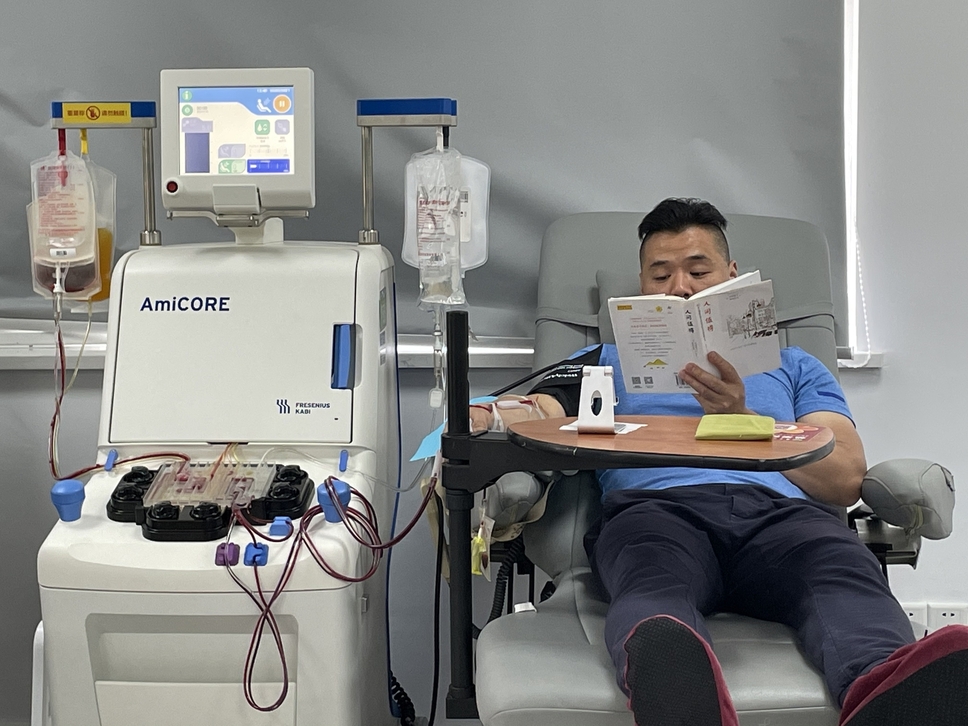脚上穿着自带的鞋套,单手捧书拜读,这不是在图书馆或是城市书房的画面,而是5月10日上午,出现在温州市中心血站新城院区机采室里的一幕。
