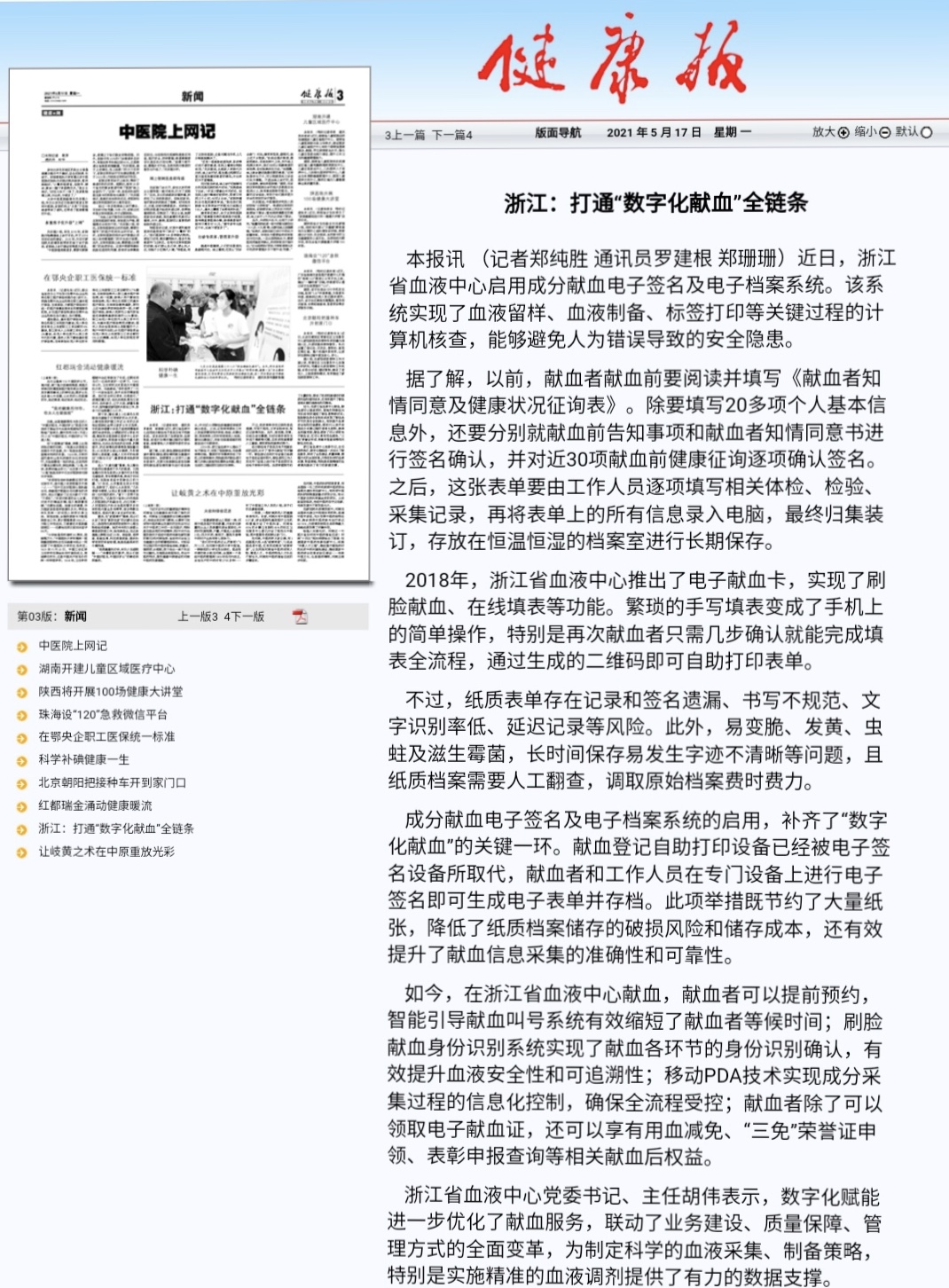 浙江的血液工作在“服”和“管”各领域的次第开花,正是坚持数字化改革,以数字赋能创造、拓展更多应用场景的标志性成果。