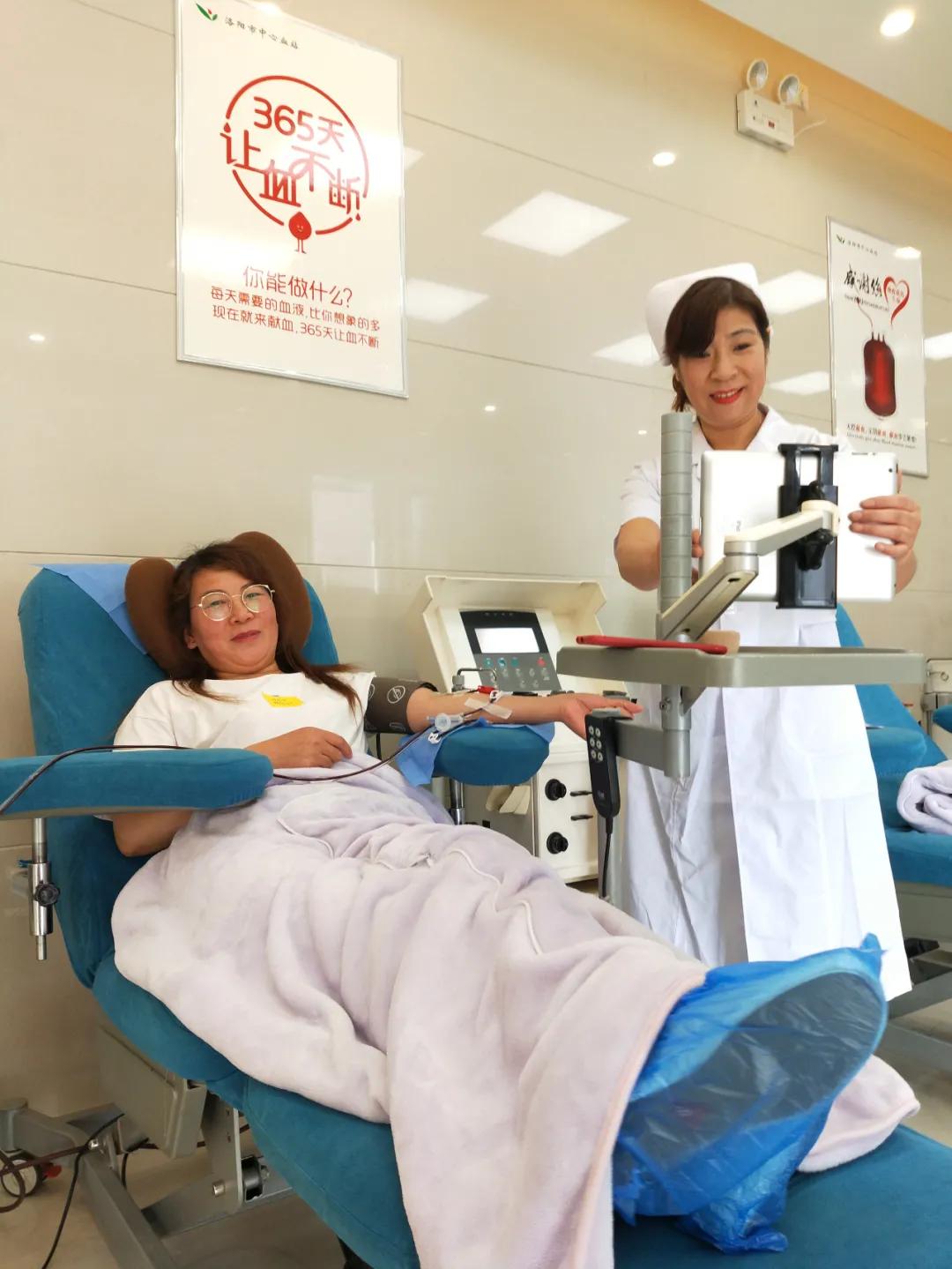 郭金红在洛阳市新安县县城居住,她从2002年6月25日开始献血,已坚持献血19年,累计献血143次,其间共捐献全血11次4400毫升、单采血小板132次151个治疗量。由于单采血小板只能在市区捐献,她132次乘坐长途汽车往返90公里,为爱奔波11800公里。 2019年5月25日,郭金红一大早乘坐长途汽车赶到洛阳市中心血站纱南献血屋献血,上图是她第100次献血时的场景,她也有幸成为洛阳市第100位百次无偿献血者。