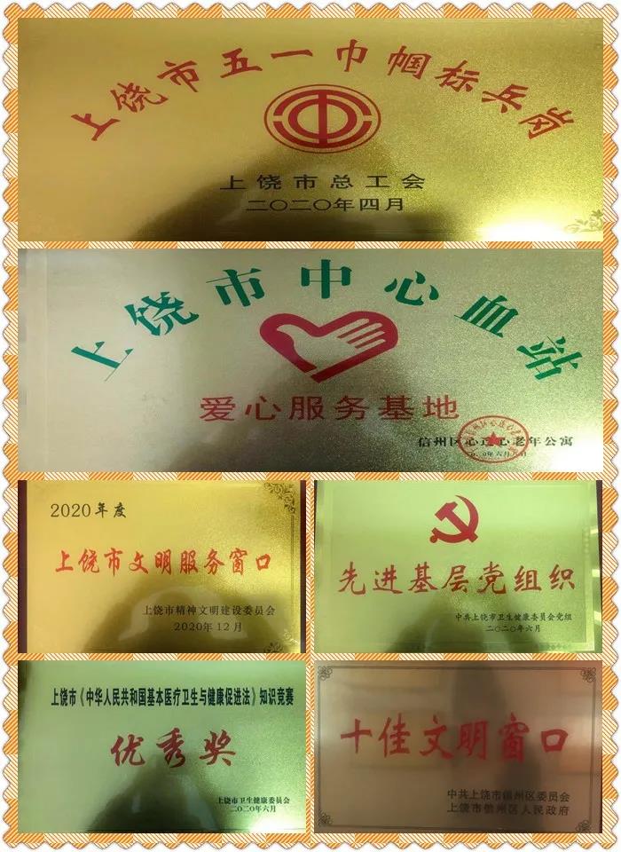 这些年在上级部门的坚强领导下,在社会各界的大力支持下,全站职工共同努力,认真贯彻落实“一法两规”,狠抓血液安全、创新宣传模式,提升服务水平,着力推动无偿献血工作发展,我市无偿献血工作取得了新的令人瞩目的成绩。2021年,我市累计获得全省献血表彰的献血者一共有2714人,其中金奖383人、银奖612人、铜奖1719人;全省无偿献血促进奖单位18家、个人无偿献血促进奖3人;全省无偿献血志愿服务终身荣誉奖8人,上饶市连续七次蝉联“全国无偿献血先进市”称号;上饶市中心血站先后荣获“全国卫生计生先进集体”、“全国无偿献血宣传先进集体”、“全国无偿献血促进奖(单位奖)”、“全国表现突出采血班组”“全省无偿献血先进单位”、“全省血站先进单位”、“全国巾帼建功先进集体”等40余项荣誉称号。