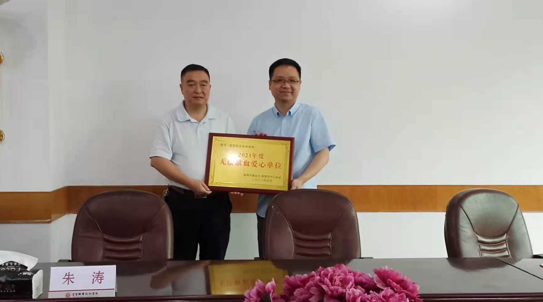 5月17日,宜宾市中心血站副站长胡可一行,专程将一块印有“2021年度无偿献血爱心单位”的牌匾,送至宜宾职业技术学院,以感谢学院在开展党史学习教育的当下,组织上千名师生踊跃加入到无偿献血社会公益行动之中。
