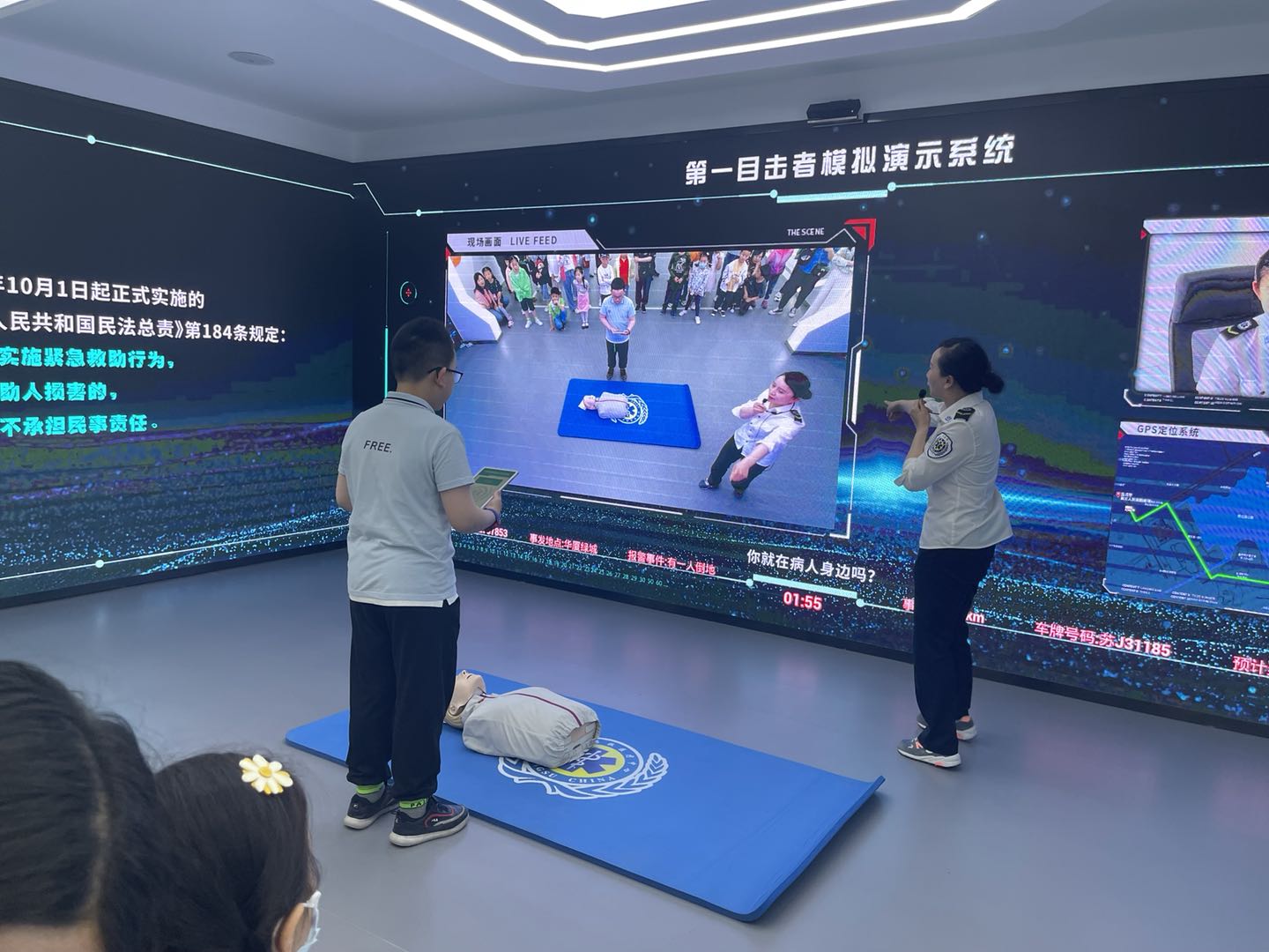 接着大家来到三楼,通过各种场景体验,包括第一目击者模拟演示、虚拟灭火体验系统、自然灾难逃生避险模拟体验、校园安全互动游戏区域,寓教于乐,让孩子在愉快的氛围中,学到了常用的急救知识。