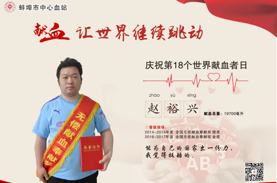 随着一次次地走上献血车,他对无偿献血以及血液相关的知识了解得越来越深入。“自愿无偿献血是唯一安全的血液来源。如果我们都不献血,躺在医院病床上急需用血的人该怎么办?”不断健全的无偿献血激励机制,每两年一次的全国无偿献血表彰活动,还有用心设计以献血者为中心的各种服务,都极大地提升无偿献血的好感度,也让像赵裕兴一样的热血市民体会到“我献血·我健康·我快乐”的真正含义。