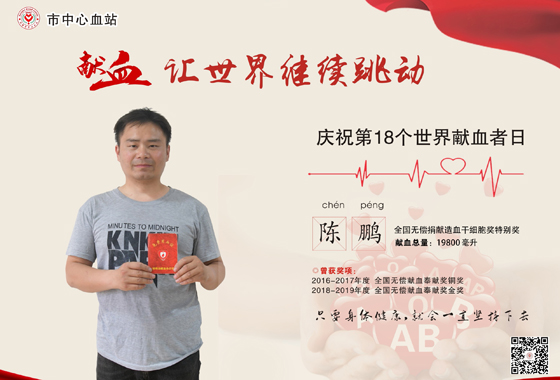 陈鹏是蚌埠市中医医院肺病科的一名男护士,目前已累计献血19800毫升,曾荣获2016-2017年度全国无偿献血奉献奖铜奖、2018-2019年度全国无偿献血奉献奖金奖以及全国无偿捐献造血干细胞奖特别奖。在他看来,献血是一件再正常不过的事情,只要身体健康,只要符合献血标准,就会一直坚持下去。