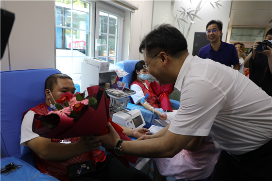 (市政府副市长、市无偿献血领导小组组长谭建上为献血者授花)