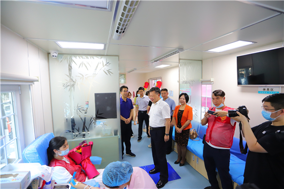 (市政府副市长、市无偿献血领导小组组长谭建上一行看望慰问正在献血的献血者)