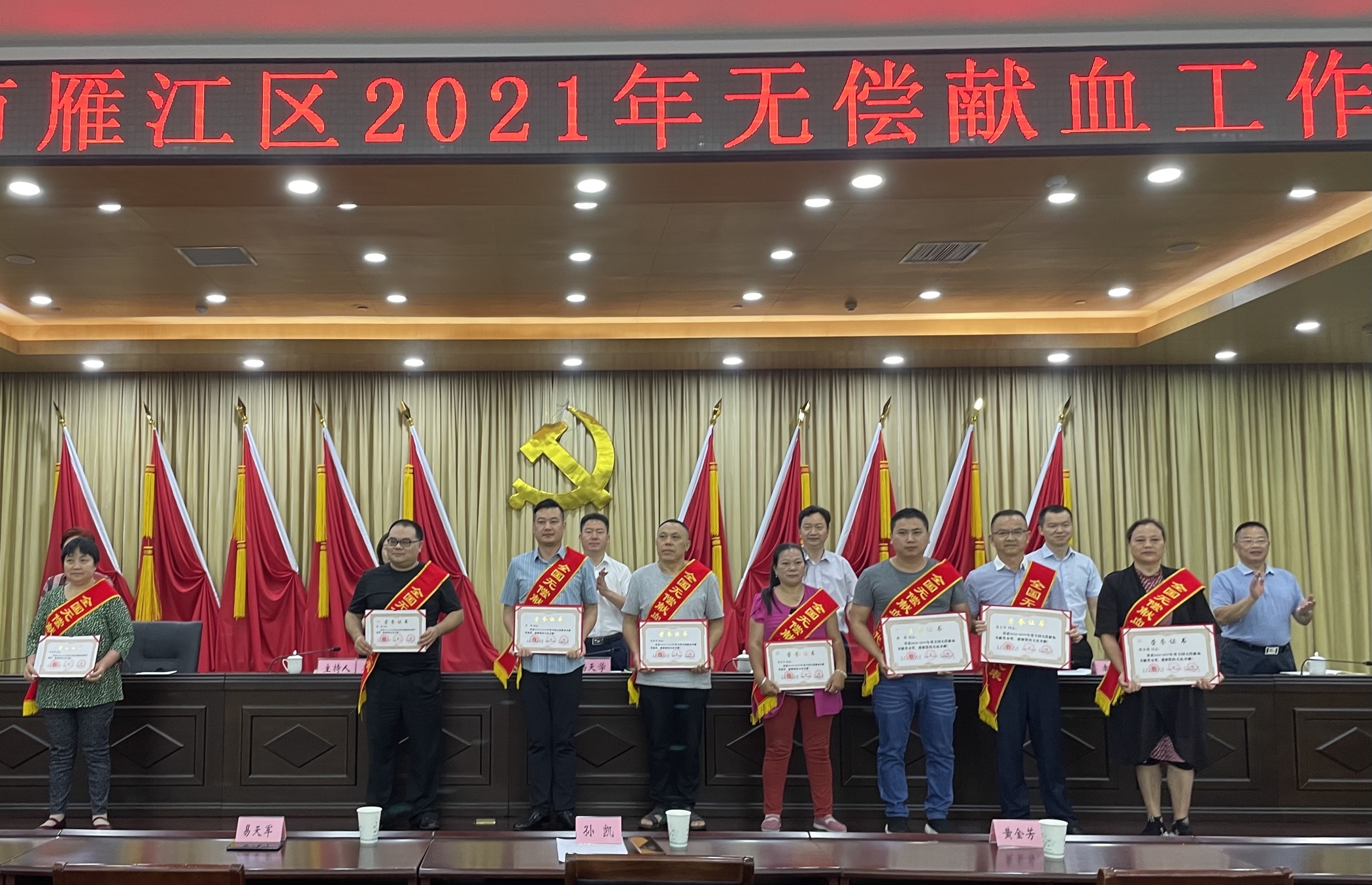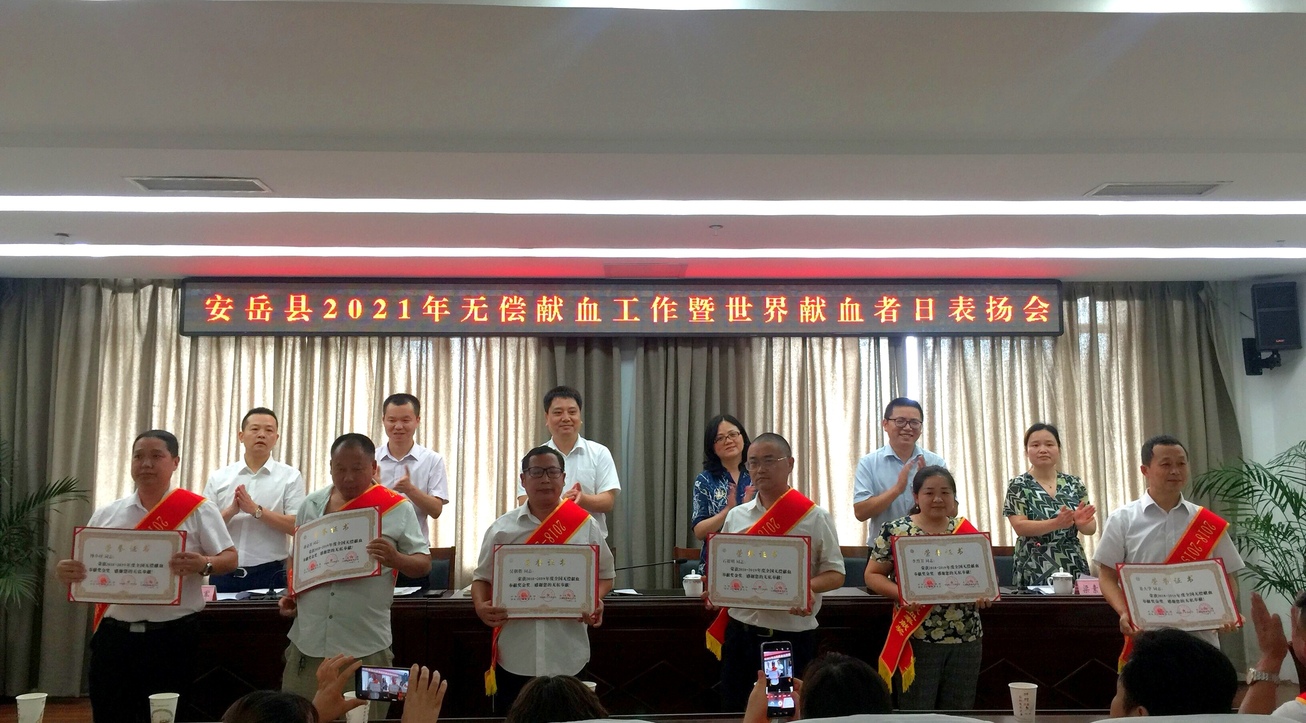2021年6月14日是第18个世界献血者日,今年世界献血者日的主题是“献血,让世界继续跳动”。为表彰为无偿献血做出突出贡献的先进集体和先进个人,弘扬无偿献血、无私奉献的精神,引导社会各界参与支持无偿献血,推动全市无偿献血事业健康发展。6月10日至11日,资阳市献血办、市卫健委联合各县(区)政府、献血办、卫健局分别召开无偿献血表彰大会,隆重庆祝第18个世界献血者日。市公民献血领导小组副组长、市卫健委主任高远,市献血办主任、市卫健委副主任樊劲等分别出席县(区)表彰会议并讲话,各县(区)四套班子有关领导出席会议,献血领导小组成员单位、辖区医疗卫生机构、乡镇(街道办事处)有关领导及获得全国无偿献血奉献奖的献血者代表参加会议。