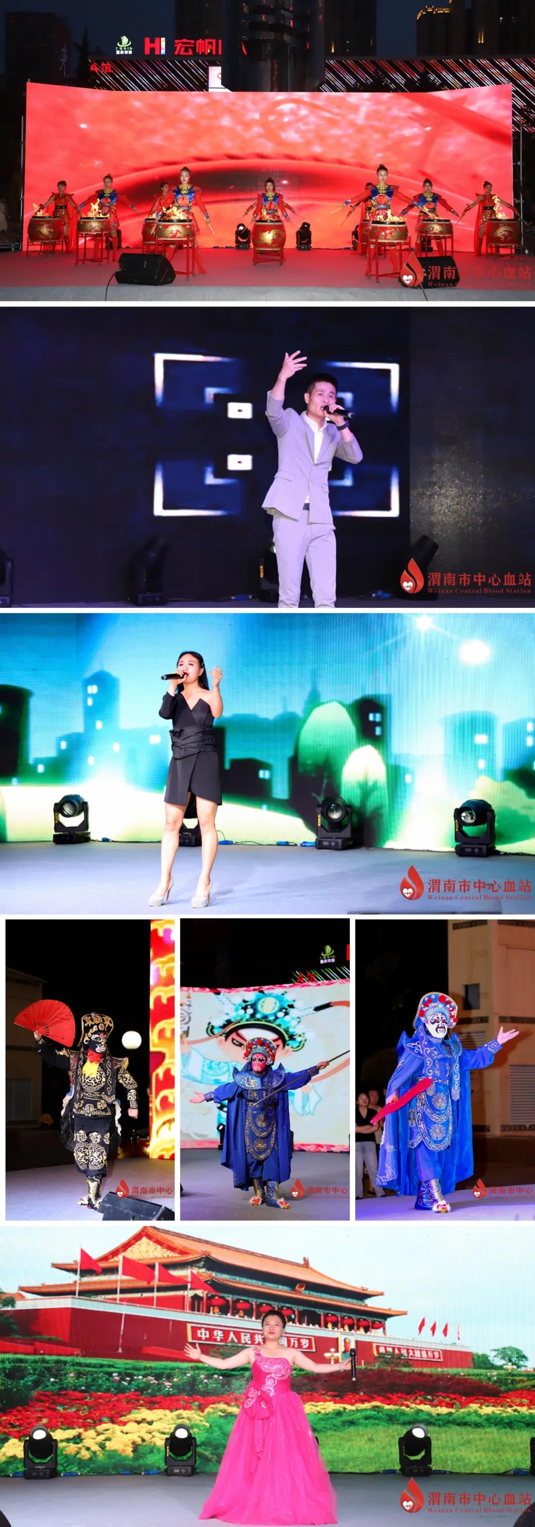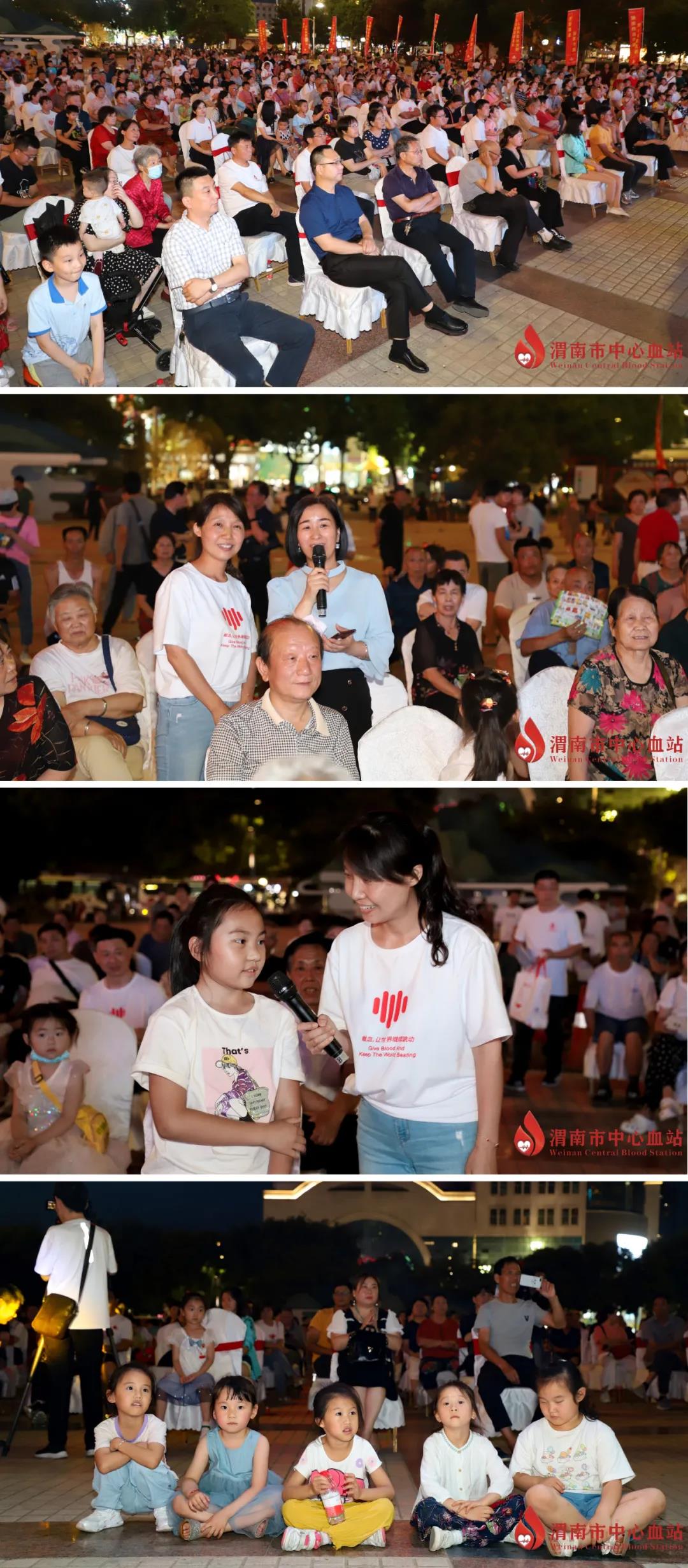 傍晚,渭南市中心血站还精心策划举办了“庆祝建党100周年暨献血者之夜”感恩主题活动,形式多样的文艺表演,有趣的无偿献血知识问答,庆祝党的百年华诞,并邀请无偿献血者个人、团体登台演出、展现才艺,共同讴歌新时代,传递正能量。中心广场的节目赢得观众阵阵掌声,与此同时在城区信达广场、宏帆广场、市博物馆、市行政服务中心举行了“感恩献血者灯光秀”活动,也引得众人驻足观看。音乐缓缓响起,霓虹灯闪烁,“无偿献血 奉献爱心”等字幕“点亮”城市的夜幕,向全市每一位无偿献血者表达敬意,现场氛围十分感人。