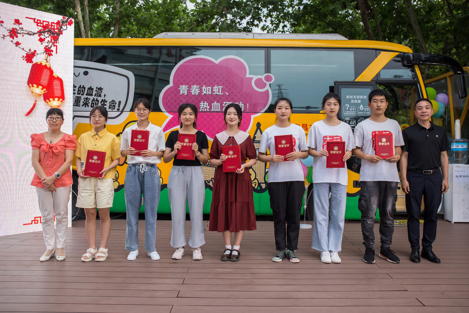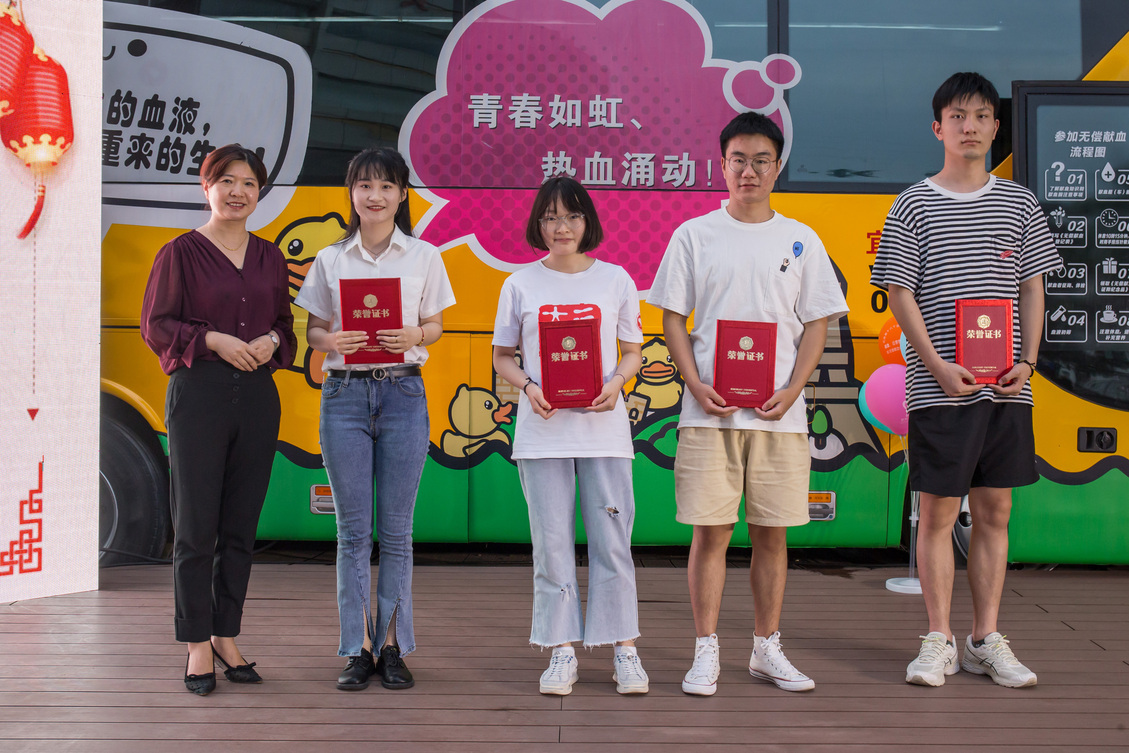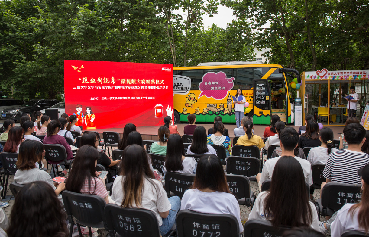 在第十八个“世界献血者日”来临之际,由宜昌市中心血站、三峡大学文学与传媒学院联合举办的2021年春季校外实践活动——“热血新视角”无偿献血微视频大赛的颁奖仪式在西苑“小黄鸭”主题爱心献血车前隆重举行。三峡大学文学与传媒学院党委书记李素芹,三峡大学文学与传媒学院学工办主任袁建军、三峡大学文学与传媒学院教授张芹、宜昌市中心血站书记张莉、宜昌市中心血站副站长张卫华、宜昌市中心血站副站长袁玉荣席本次颁奖仪式,此外,近百名学生及青年志愿者参加了此次活动。