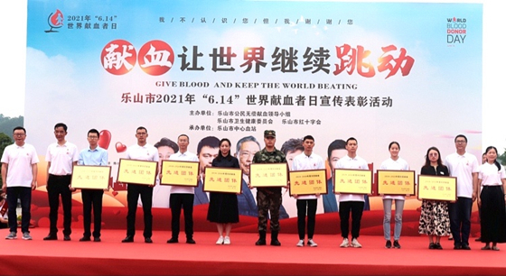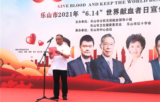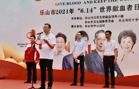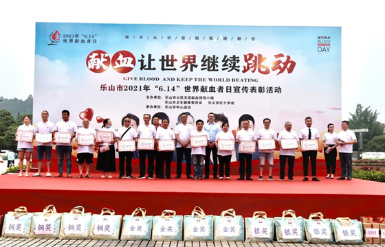 在第18个世界献血者日来临之际,乐山市公民无偿献血领导小组办公室、乐山市红十字会、乐山市卫生健康委员会主办,乐山市中心血站承办的2021年乐山市无偿献血宣传表彰活动于6月11日在乐山新广场举行。乐山市人民政府副秘书长门姜,乐山市红十字会专职副会长彭明宣,乐山市卫生健康委员会党组成员、副主任曾伟出席大会,400名来自全市各行各业《2018-2019年度全国无偿献血奉献奖》获奖代表、高校志愿者及各单位代表参加了大会。