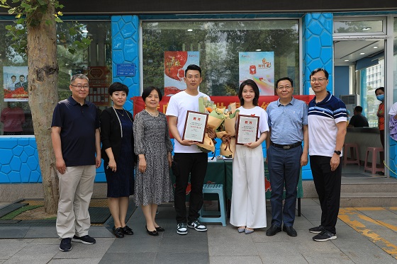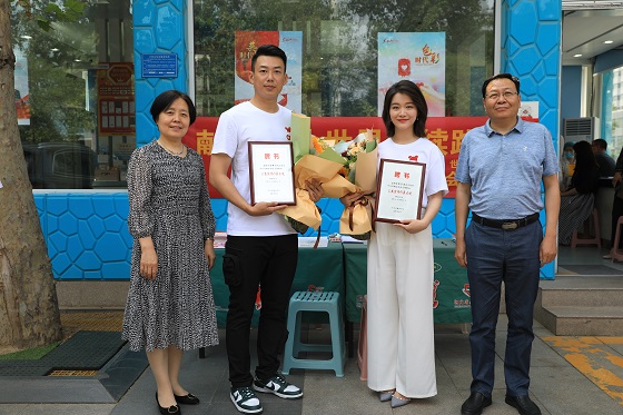 河北省输血协会理事长常缨、秘书长赵贵起分别为郭子雪、李耀阳授聘书。河北省血液中心副主任陈莉、党委副书记牛宏伟为二人赠送鲜花,并合影留念。