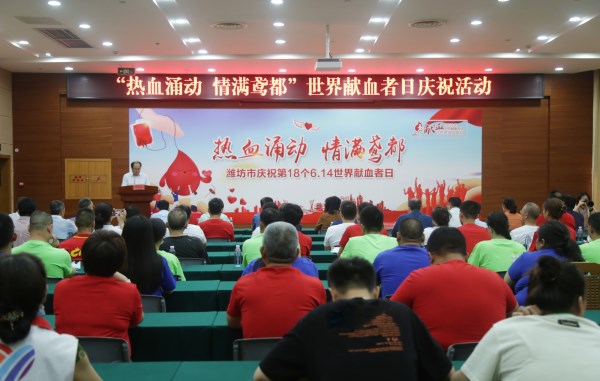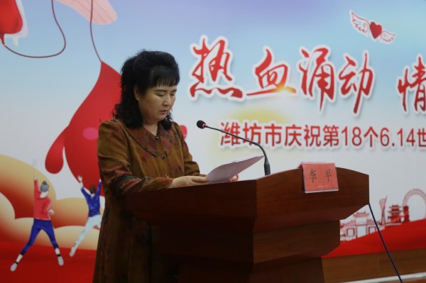 6月13日上午,潍坊市“世界献血者日”庆祝活动在市工人文化宫举行。潍坊市副市长李平出席会议并讲话,市文明办、市总工会、市卫健委、市民政局、共青团潍坊市委等部门以及无偿献血志愿者代表120余人参加活动。会议为获得2018-2019年度全国无偿献血奉献奖的代表颁奖并为无偿献血奉献奖代表颁发“无偿献血荣誉卡”。