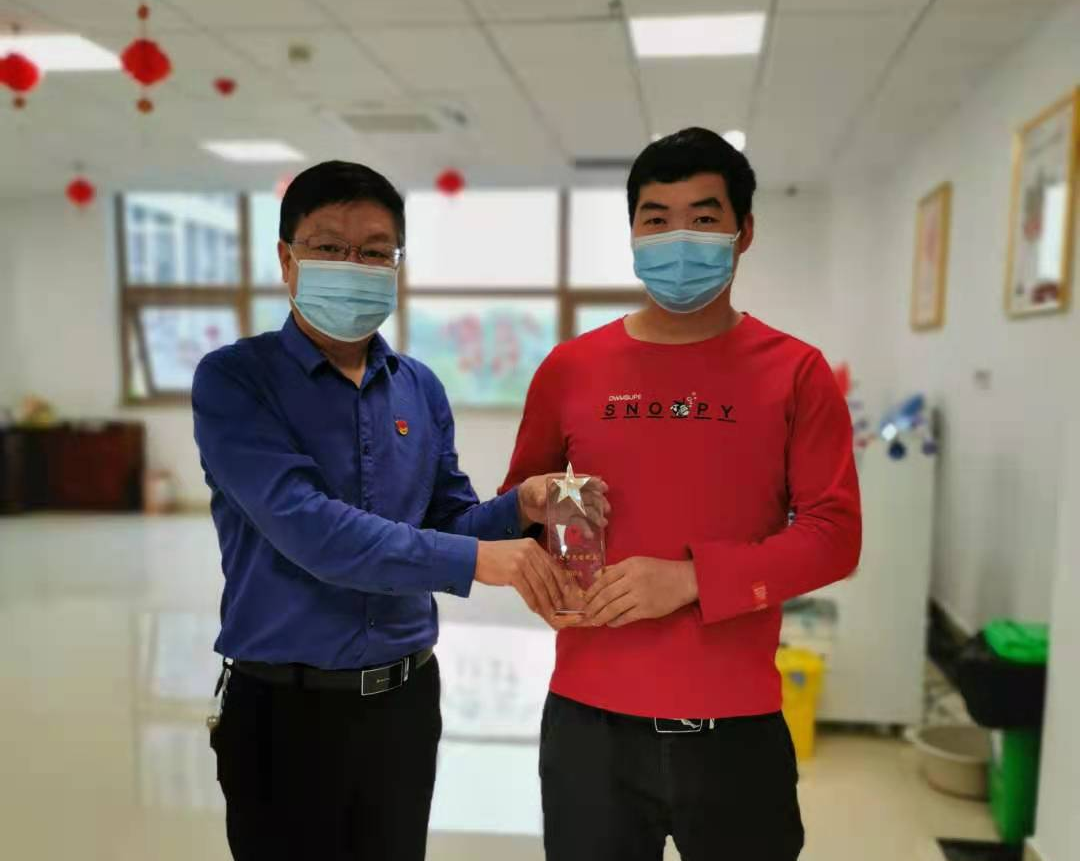 (市中心血站副站长付友恒为简军先生颁发奖杯)