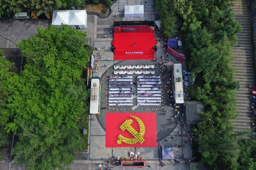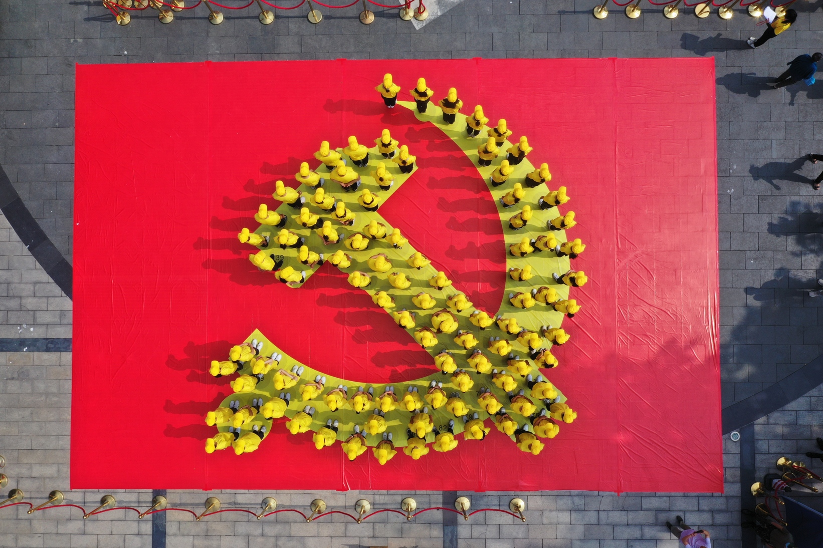 今年是中国共产党成立百年华诞。在现场参与活动的100名党员和团员们身穿黄色T恤,拼出巨型党徽 ,用这个非常特殊的形式和献血的行动,献礼建党100周年,表达对生命健康的美好祝福!