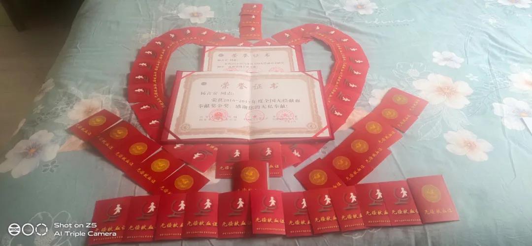 家住韩城的杨吉安,因为路途比较远,每次为了献血,他都会早晨5点出发,希望赶在我们上班时能顺利捐献血小板。从 2009年杨吉安就与献血结缘了,截止目前杨吉安已经捐献19400 毫升血液,其中捐献全血9次,3600毫升,捐献血小板79个治疗量,先后获得 2014-2015年度全国无偿献血奉献奖铜奖、2016-2017年度全国无偿献血奉献奖金奖。