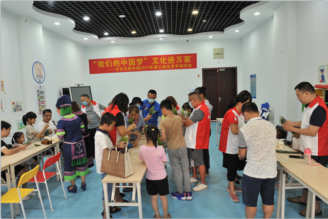 在第18个“世界献血者日”即将到来之际,为感谢一直积极参与无偿献血的爱心人士,百色市中心血站与市图书馆联合举办了“我们的中国梦·文化进万家”爱心献血者专场活动,特邀请献血者带着孩子一起来学习、体验端午节“羊角粽”的制作。