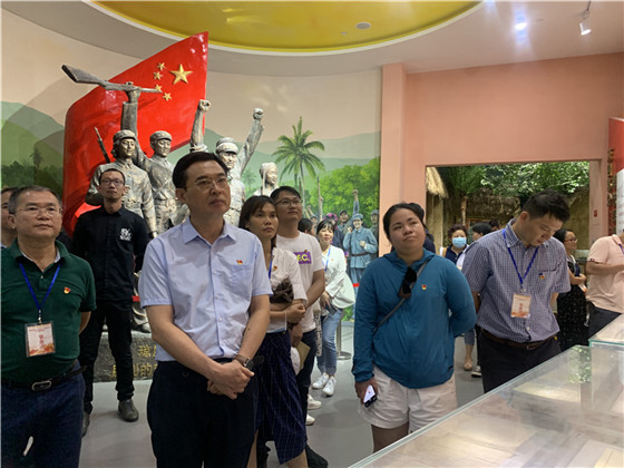 在五指山革命根据地纪念园纪念碑前,党员们列队站齐,面向党旗,脱帽默哀,对革命先烈致以深切缅怀,举起右手,重温入党誓词,接受党性洗礼。在革命历史陈列馆前,中心领导还为本月过政治生日的4位党员赠送政治生日贺卡,送去组织关怀与祝福。