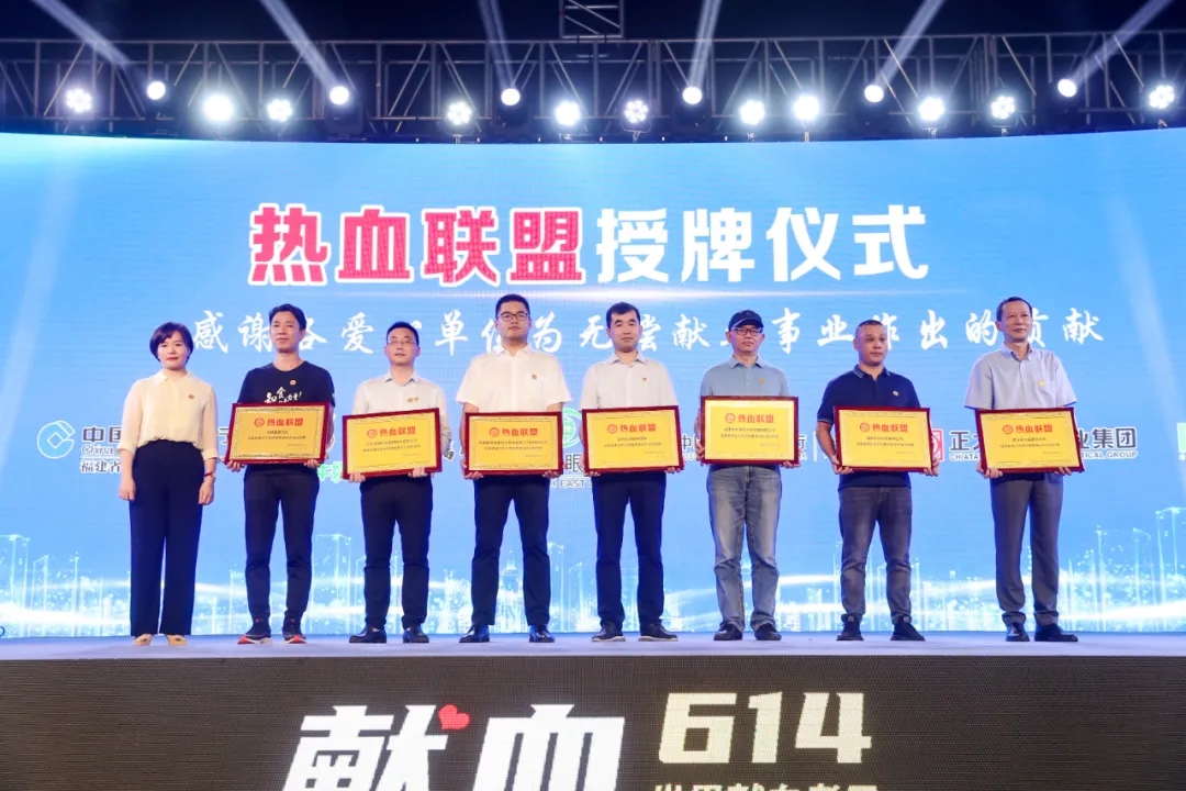 活动现场,建设银行福建省分行、福建长富乳品有限公司、福建大梦书屋文化传媒有限公司、福州东南眼科医院、中国邮政储蓄银行股份有限公司福州市分行、正大天晴药业集团股份有限公司、EO健康沙拉等7家单位荣获了“热血联盟”的称号。